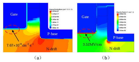 图3. SiC MOSFET在UIS过程中的 (a)碰撞电离率分布 (b)电场分布[1]