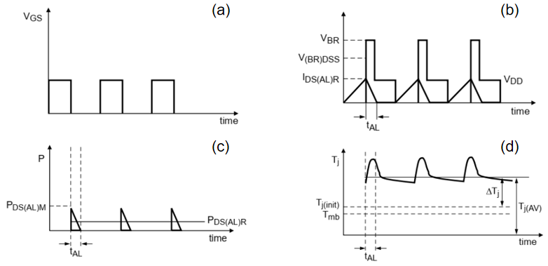 图5. 重复UIS过程中的(a)VGS-t (b)VDS-t和IDS-t (c)PDS-t (d)结温变化