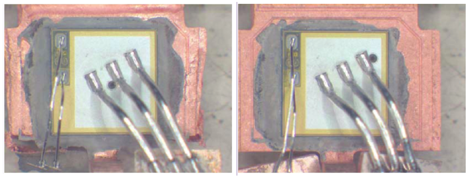 如果雪崩事件的持续时间在毫秒级(ms),通常会在晶圆中央——即电流密度最大的位置——出现烧毁痕迹。这是由于连接引线与晶圆结合部的电流密度较高,导致该区域易于失效。然而,由于散热片的存在,失效点往往不会出现在引线连接点的正下方,而是发生在晶圆温度最高的区域。