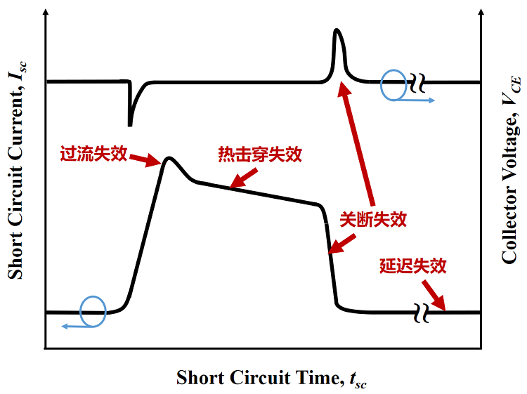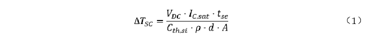 原理:短路过程中,大电流叠加高电压使结温短时内急剧上升,局部热点温度超过本征热击穿临界值。温升由式(1)提供,与母线电压VDC、稳态短路电流IC,sat 、短路时间及材料/器件参数相关相关。