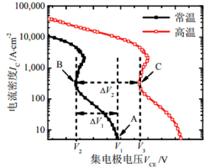 b. B->C:电流持续集中,元胞温度上升,由于IGBT击穿电压呈现正温度系数,元胞的击穿电压也迅速上升,曲线从B点转移至C点。电压从B点变成C点的电压差记为△V2。