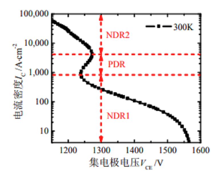 第一负阻区(NDR1):电流密度上升,漂移区的可移动电荷浓度达到漂移区固定电荷浓度的数量级,集电极电流中空穴电流大于电子电流,从而漂移区的净可移动电荷表现为正电性,会增大漂移区的电场斜率,而电场斜率的增大会导致集电极电压 VCE减小,表现出负阻特性。