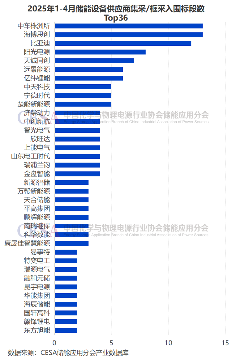 2025年1-4月,中电建、中核集团、中广核、华电集团、国电投、华能集团、中石油、尚威环境、三峡集团、新风光等多个企业储能系统/电芯集采/框采招标工作落地。由于多数储能集采/框采项目未公布各中标企业的具体分配占比,我们以入围标段数量作为主要分析对象。据CESA储能应用分会产业数据库不完全统计,1-4月共有18家企业入围标段数不低于4个,其中,中车株洲所、海博思创和比亚迪储能集采/框采入围均超过10个标段数,表现尤为突出。