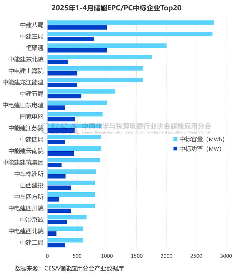 就储能EPC/PC中标企业分析,2025年1-4月,中能建、中建、中电建三大集团中标规模高达8.87GW/23.96GWh,占全国储能EPC/PC(含设备)采招落地总规模的58.75%。