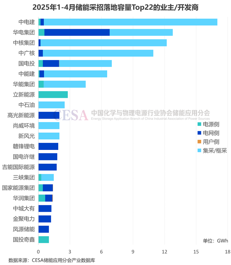 就业主/开发商需求分析,2025年1-4月,国内共421家企业完成储能(含设备)相关采招工作。大规模采购需求主要来自于大型能源央企,其中,中电建、华电集团、中核集团、中广核采招落地规模均在10GWh以上,需求最多。国电投、中能建采招落地超6GWh,华能集团采招落地规模在4GWh以上。此外,立新能源、中石油、新风光、尚威环境、高光新能源采招落地规模均超过2GWh,赣锋锂电、国电许继、吉能国际能源、三峡集团、国家能源集团、华润集团、中城大有、金聚电力、国投奇鑫、凤源储能采招落地规模也都在1GWh以上。