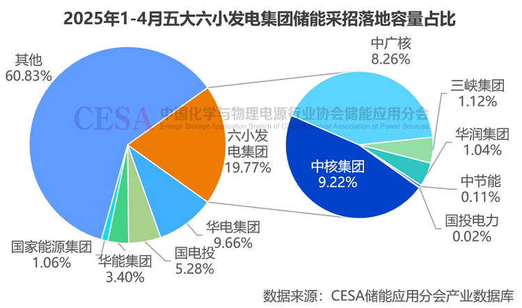 值得一提的是,电力央企是储能需求的主要驱动力之一。2025年1-4月,五大六小发电集团储能采招落地规模超50GWh,占比高达39.17%。其中,华电集团、国电投、华能集团、国家能源集团等五大发电集团采招落地规模共25.67GWh,占比19.40%;中核集团、中广核、三峡集团、华润电力等六小发电集团采招落地26.15GWh,占比19.77%。