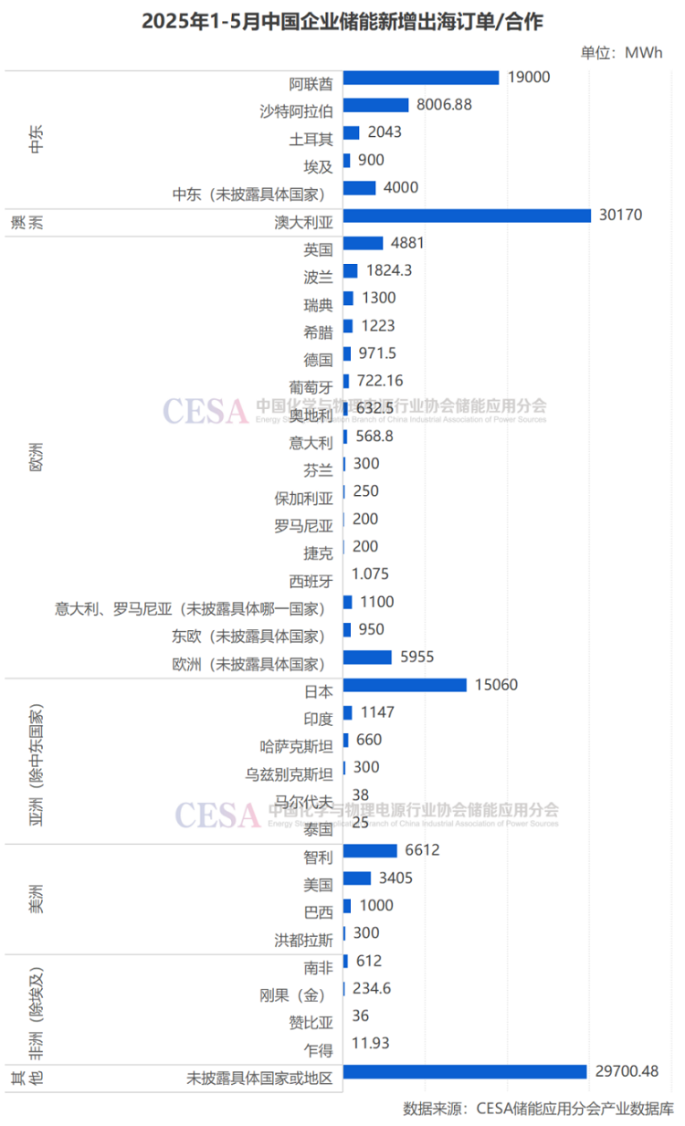 海外订单方面,据CESA储能应用分会产业数据库统计,2025年1-5月,中国储能相关企业新增出海订单/合作已超过144GWh,较去年同期增长了436.27%,其中114.64GWh披露了项目建设国家或区域,但海外拓展的重点,与过去相比正发生显著变化。