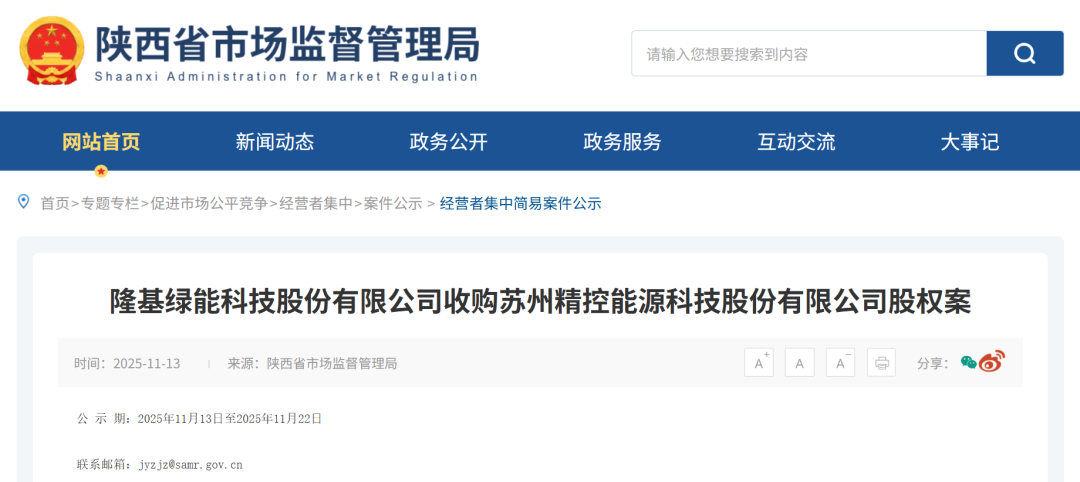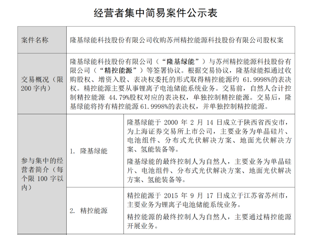 到11月13日,陕西省市场监督管理局发布公示称,隆基绿能拟通过收购股权、增资入股、表决权委托的形式取得苏州精控能源科技股份有限公司(简称“精控能源”)约62%的表决权,交易完成后,隆基绿能将单独控制精控能源。