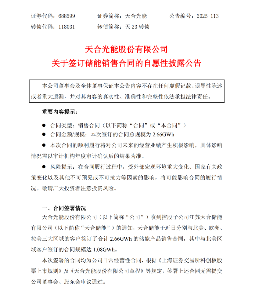 11月17日,天合光能发布公告称,子公司天合储能成功与北美、欧洲、拉美三大区域的客户签订总额达2.66GWh的储能产品销售合同。其中,与北美区域客户签订的合同规模尤为亮眼,高达1.08GWh。