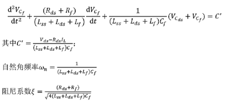 核心结论: 震荡的根源在于由功率回路寄生电感(Lss,Lds,Lf) 和续流二极管结电容(Cf) 构成的LC谐振回路。在典型的SiC应用中,回路电阻很小,系统处于欠阻尼状态(ξ<1),能量在电感和电容间反复交换,形成衰减缓慢的正弦振荡。