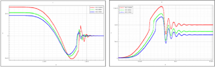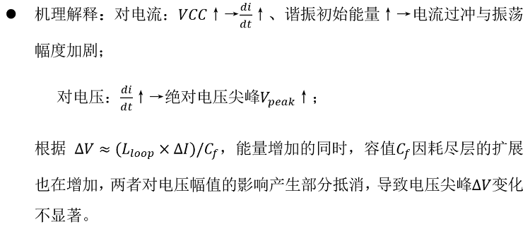 l 影响规律: VCC升高,电流震荡显著加剧,Vpeak上升,电压震荡的相对尖峰值(ΔV)变化不明显。对比波形如图二。