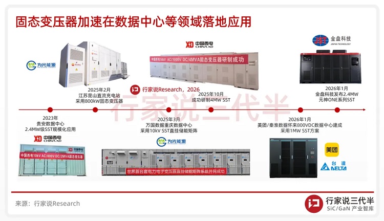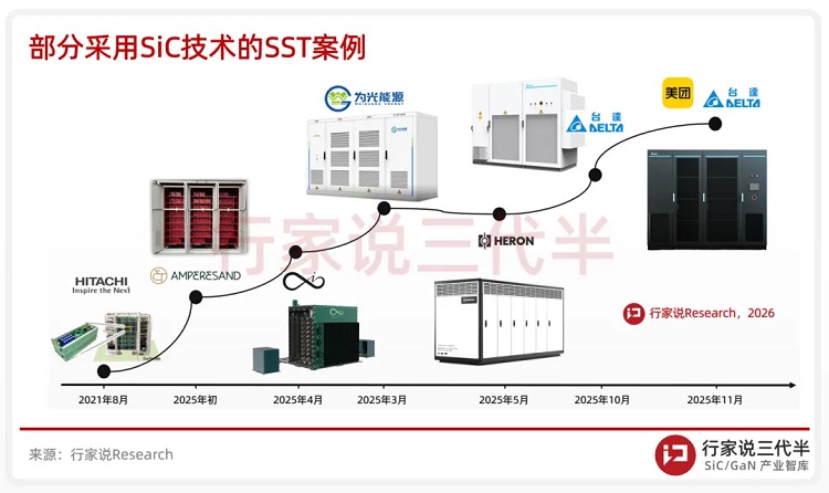 而在固态变压器环节,SiC器件则备受青睐。“行家说三代半”调研发现,2025年以来基于SiC技术的SST系统已经实现了商用化落地,并且相关产品研发形成了热潮。