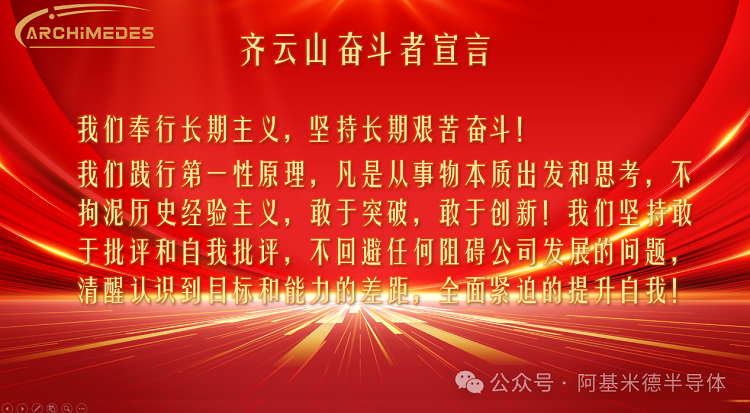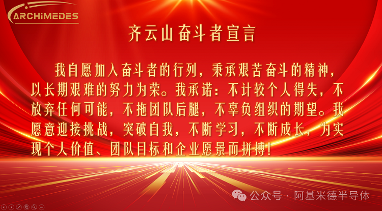 峰会最后,由公司管理团队拟定《齐云山宣言》并与核心骨干共同宣誓,从战略聚焦、DAY ONE 心态、战略协同、战略稳健、战略人才五个维度诠释公司未来发展目标。全体成员用铿锵有力的誓言表明决心:以奋斗者的姿态坚持初心,以开拓者的热情迎接未来。乘风破浪潮头立,扬帆起航万里行。坚持奉行长期主义,坚持长期艰苦奋斗,践行第一性原理,凡是从事物本质出发和思考,不拘泥历史经验主义,敢于突破,敢于创新!让我们坚持、敢于批评和自我批评,不回避任何阻碍公司发展的问题,清醒认识到目标和能力的差距,全面紧迫的提升自我!客户至上,胆大包天地创新,绞尽脑汁地为客户创造价值。三年风雨兼程,齐云山峰会如灯塔般照亮未来,激励每一位奋斗者在创新与拼搏的道路上,肩负使命,砥砺前行。带着“Day One”的初心与勇气,阿基米德团队定能在功率半导体行业开创新的辉煌篇章!