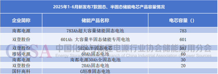 2025年1月至6月期间,储能行业共推出七款固态及半固态储能电芯产品,涵盖多个技术路线与应用场景,展现出行业在电芯容量突破与技术迭代上的显著进展。南都电源率先发布两款产品,其中"783Ah固态电池"以783Ah的容量创下同期最高纪录,彰显其在大型储能领域的技术实力;另一款"30Ah全固态电池"则聚焦小型化场景,形成高低搭配的产品矩阵。
