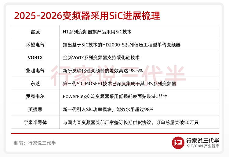 据“行家说三代半”调研发现,除了汇川外,还有越来越多的变频器企业开始采用SiC技术。据不完全统计,2025年至今已有禾望电气、东芝等7家厂商发布SiC变频器,说明SiC正从技术验证跨越到实际应用阶段。